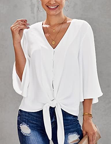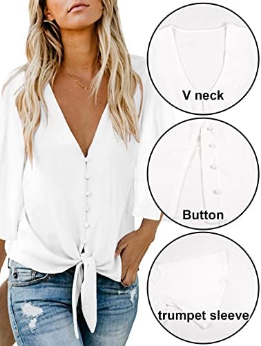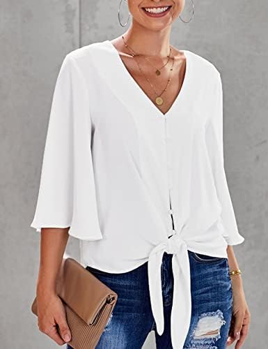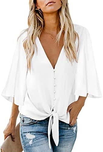 Questa camicetta casual presenta un sexy scollo a V con bottoni e un nodo frontale per un look carino.