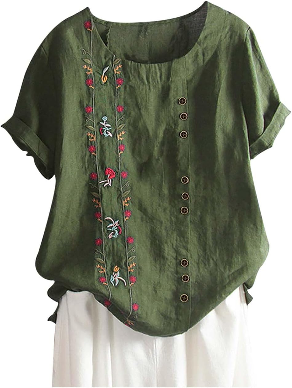 Donna Camicia Casual in Lino Camicia in Cotone e Lino Donna Maniche Corte Girocollo Taglie Forti Maglietta Ampia Elegante Estiva...