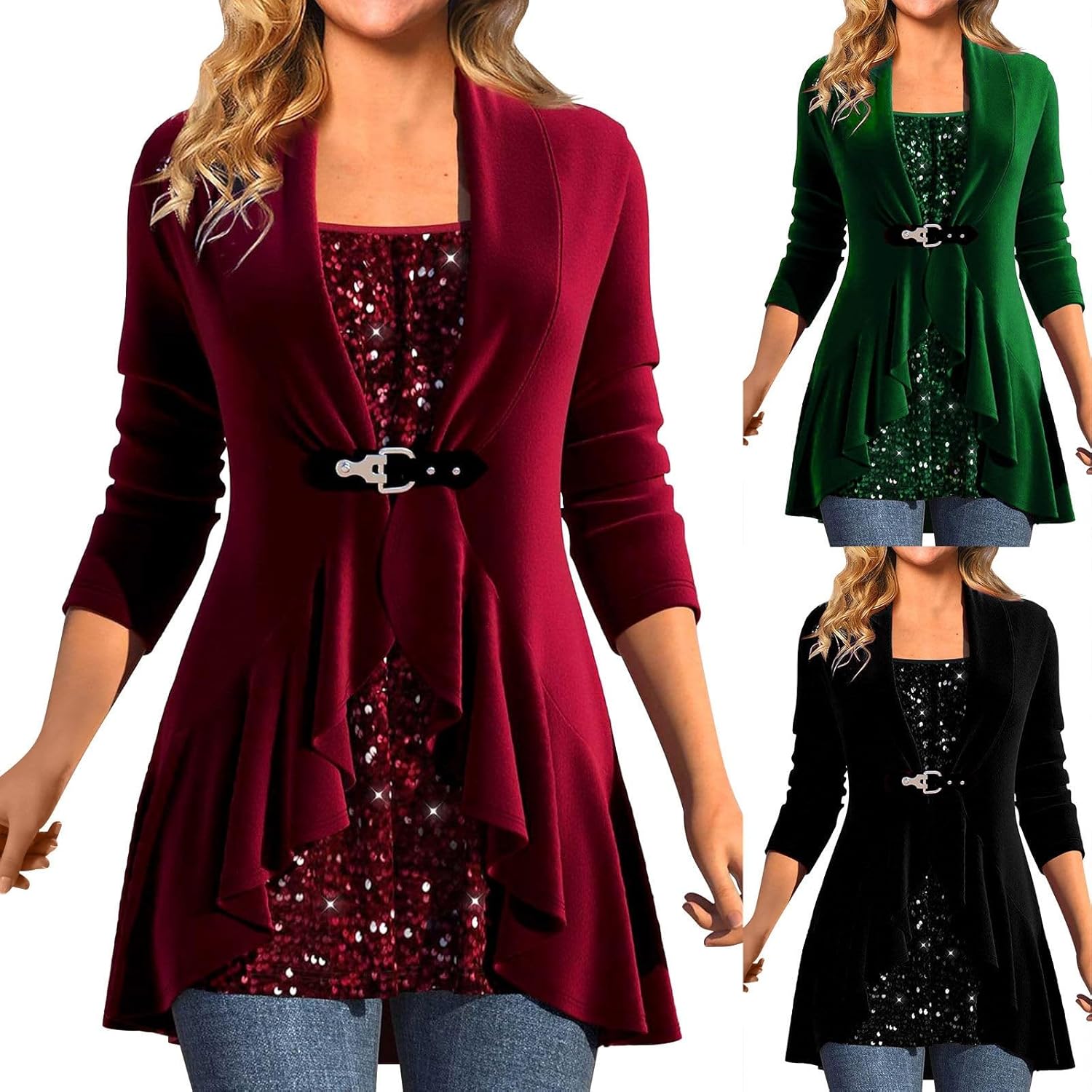 HEONSATI Maglietta Donna Paillettes Maglia Cerimonia Maniche Lunghe Maglietta Glitter Casual Taglie Forti Tops Brillantini Scollo a V Camicetta Cotone...