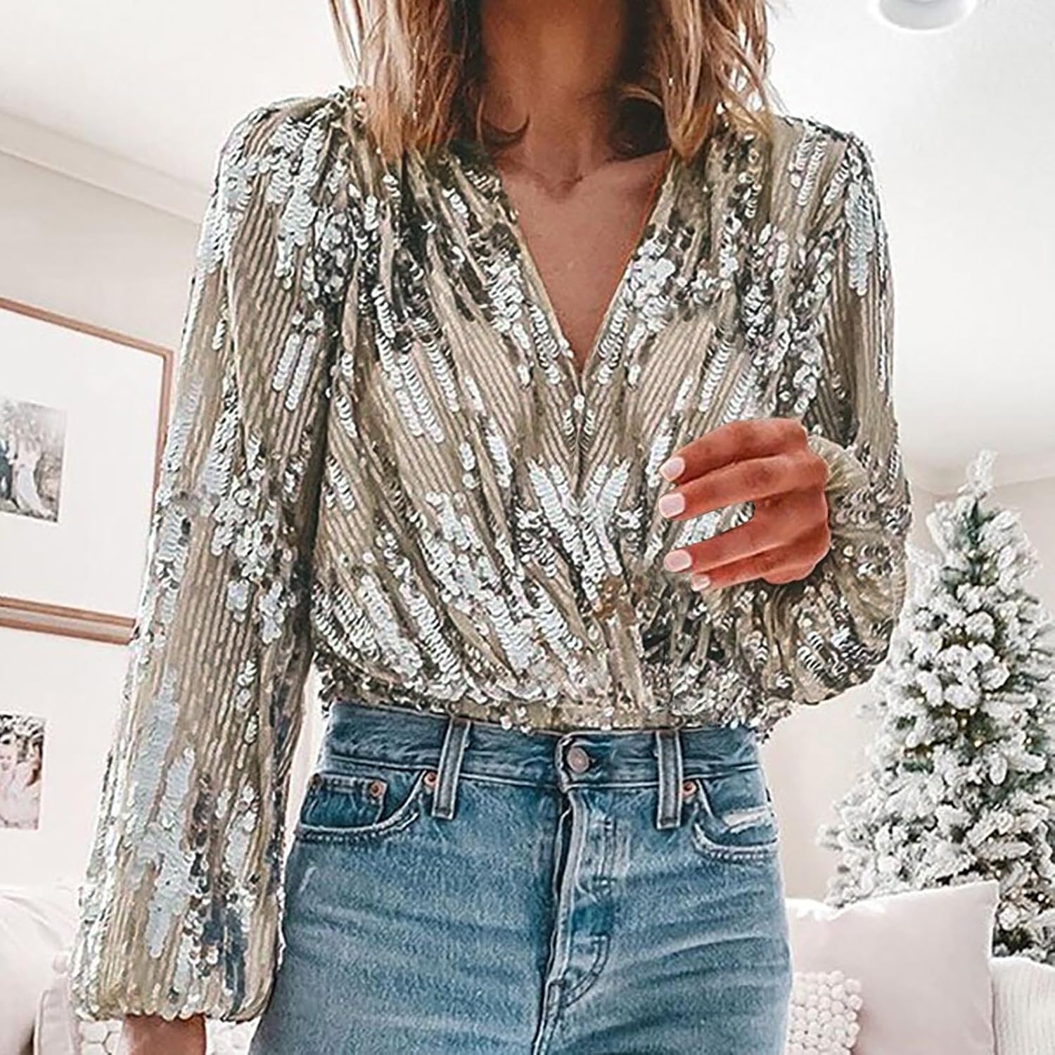 HEONSATI Magliette con Paillettes Donna Blusa Taglie Forti Scollo a V Tops Glitter Cotone Capodanno Maglietta Brillantini Maniche Lunghe Maglia...