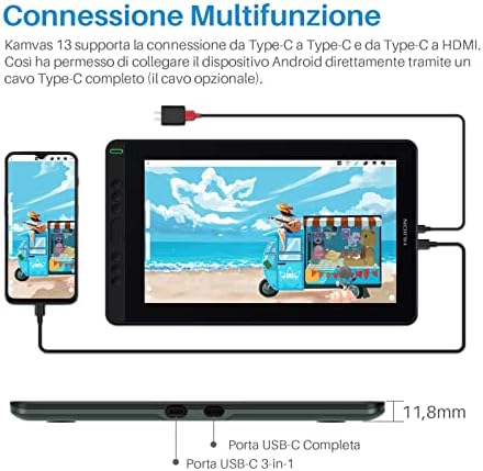 🏆 【Connessione facile e veloce】 Kamvas 13 è il primo display a penna che supporta la connettività con il dispositivo Android tramite un cavo di tipo C completo. Gli utenti possono esprimere le proprie idee su Kamvas 13 quando e dove vogliono. Oltre a una connessione da Tipo C a HDMI, Kamvas 13 supporta anche una connessione da Tipo C a Tipo C. Gli utenti possono collegare facilmente laptop che supportano l’ingresso di tipo C a Kamvas 13 senza utilizzare un adattatore da tipo C a HDMI.