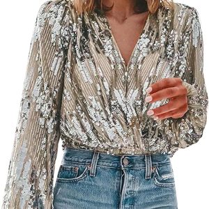 Top Donna Elegante con Paillettes Scollo a V Manica Lunga Casual Maglia da Donna Invernali Blusa Brillantini Capodanno Tops con Lustrini Camicetta Cerimonia Cotone Tshirt Donna Paillettes per Feste