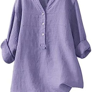 Surttan Camicia Donna Lino Cotone Estiva Elegante Manica Lunga Camicetta Taglie Forti Bianca Blusa Casual Tinta Unita Maglietta Leggera Comodo Bottoni Scollo A V T-Shirt Camicette Maglia Tops
