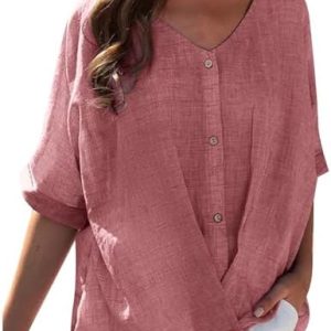MJGkhiy Camicia Donna Lino e Cotone Estiva Leggera Manica Corta Maglietta Casual Scollo A V Bottoni Blusa T-Shirt Comodo Traspirante Camicetta Top Vintage Camicette Elegante Magliette