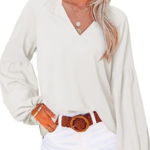 MeeQee Magliette a Manica Lunga da Donna Camicia con Scollo a V Moda Chiffon Blusa Tops Casual Allentata Pieghe Camicetta con Polsini Elasticizzati Elegante Solido Comodo T-Shirt