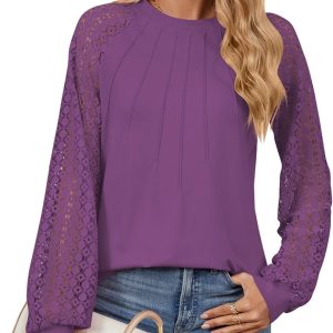 OLIPHEE Bluse Donna Elegante Camicia Donna Maniche Lunghe Pizzo Loose Tunica Donna a Tinta Unita Maglietta Donna T Shirts Girocollo Donna Tops Autunno Inverno