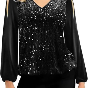 HEONSATI T Shirt con Paillettes Donna Maglietta da Sera Scollo a V Blusa Glitter Casual Cerimonia Tops con Brillantini Maniche Lunghe Maglia Invernali Taglie Forti Blusa Paillettes Donna per Feste