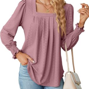 RPAEOY Camicia Donna Manica Lunga Collo Quadrato Plissettato T Shirt Elegante Blusa Altalena Camicetta Allentata Casual Lunga Tunica Top per Uscire