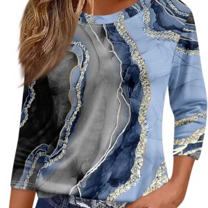 Uwdiohq Bluse Eleganti Top Girocollo Stampato con Paillettes Quotidiano da Donna T-Shirt a Maniche Sette Quarti con Fiori Stampati Camice da Lavoro Senza Maniche